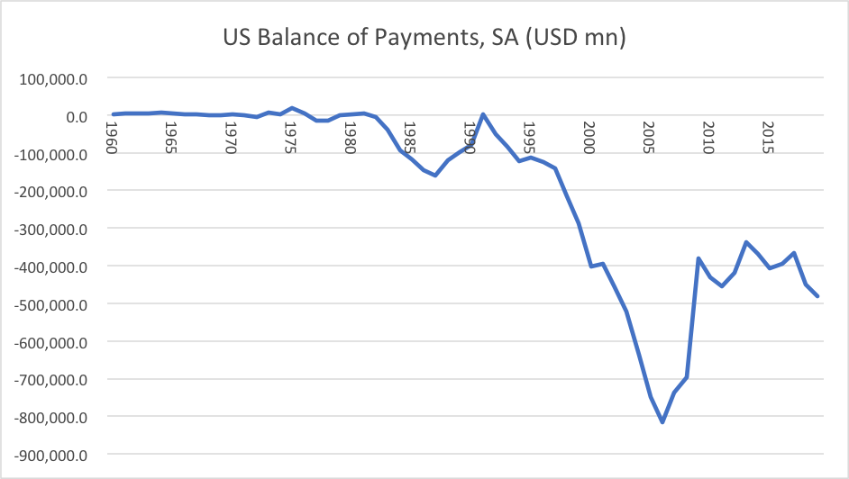 Summarising the thought process: US Dollar dominance as a reserve currency implies a need to send dollars out into the world. Sending dollars out means running an external deficit that is persistent (foreigners owning dollars = foreigners having a claim on US assets since every Dollar is an IOU on the Federal government) and the balancing term is the loss of something else – manufacturing perhaps.
