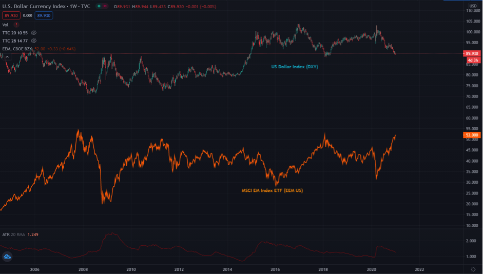 In 2020 itself, the USD DXY index has posted a peak-trough depreciation of about 13%, pretty much in a single direction following the market lows in March 2020. Concurrently, the narratives in the market about the debasing of the US dollar started to pick up. As it stands, the DXY is at a pivotal level. The chart (as of the time of writing of this note, the day before markets reopen for 2021) says it all: